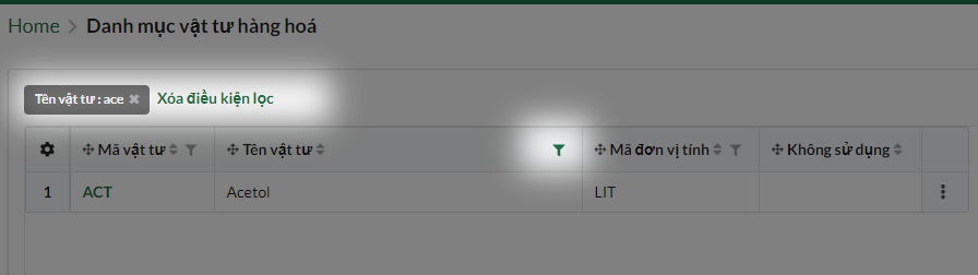 Người dùng có thể thực hiện tìm kiếm trên danh mục bằng cách nhập từ khóa cần tìm vào ô Tìm kiếm và nhấn Enter. Hoặc có thể click vào nút hình phễu trên các cột dữ liệu và nhập điều kiện tìm kiếm.