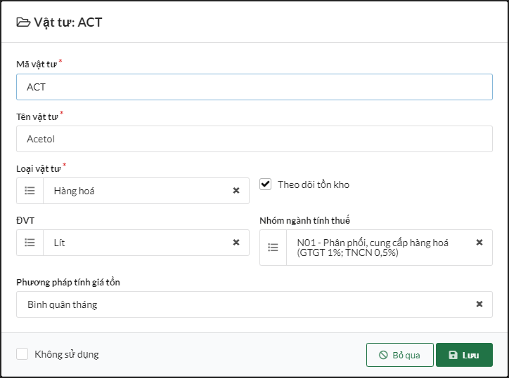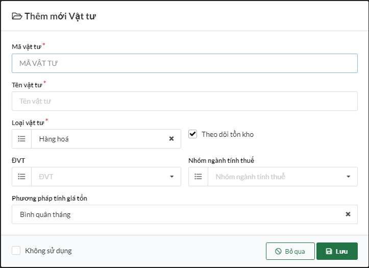 Trên màn hình này, người dùng cập nhật thông tin cần thiết sau đó nhấn nút Lưu để thêm mới danh mục, ngược lại nhấn nút Bỏ qua để hủy thao tác.