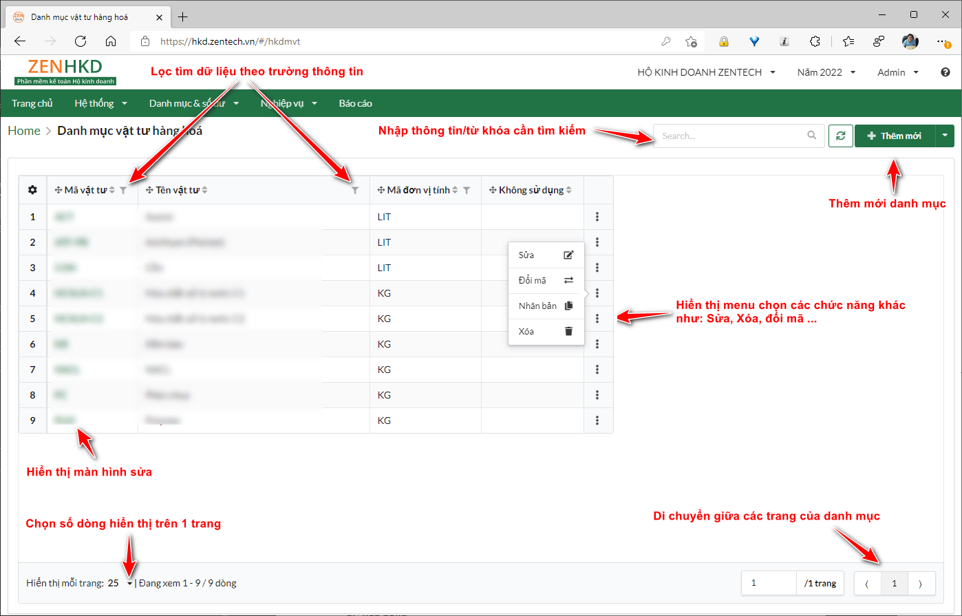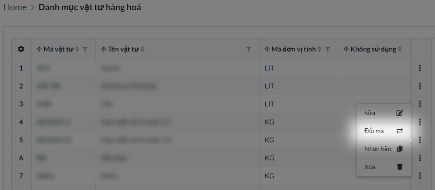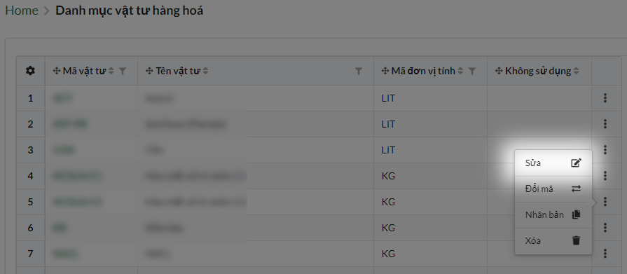 Người dùng có thể thực hiện sửa dòng đang có bằng cách click vào trường mã của danh mục đó hoặc truy cập menu tại mỗi dòng và click vào menu Sửa.