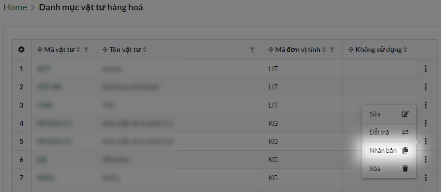 Người dùng có thể thực hiện việc nhân bản bằng cách vào menu trên dòng đó, sau đó chọn chức năng Nhân bản để thực hiện việc nhân bản dữ liệu.