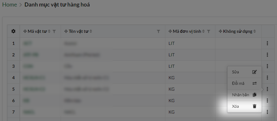 Người dùng thực hiện chức năng Xóa bằng cách click vào menu trên dòng cần xóa và chọn menu Xóa.