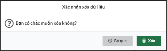 Hệ thống hiển thị màn hình xác nhận thông tin cần xóa. Người dùng nhấn nút Xóa để thực hiện xóa dữ liệu, ngược lại nhấn nút Bỏ qua để hủy chức năng.