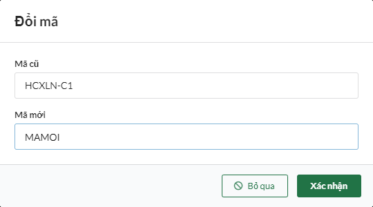 Hệ thống hiển thị màn hình Đổi mã để người dùng cập nhậtmã cũ. Sau đó nhấn Xác nhận để đổi mã, ngược lại nhấn Bỏ qua để hủy việc đổi mã.